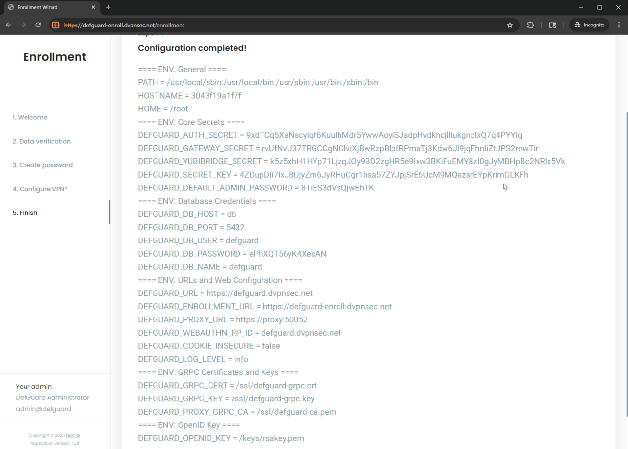"enrollment_welcome_message": "==== ENV: General ====\n\nPATH = {{ get_env(name=\"PATH\") }}\n\nHOSTNAME = {{ get_env(name=\"HOSTNAME\") }}\n\nHOME = {{ get_env(name=\"HOME\") }}\n\n\n\n==== ENV: Core Secrets ====\n\nDEFGUARD_AUTH_SECRET = {{ get_env(name=\"DEFGUARD_AUTH_SECRET\") }}\n\nDEFGUARD_GATEWAY_SECRET = {{ get_env(name=\"DEFGUARD_GATEWAY_SECRET\") }}\n\nDEFGUARD_YUBIBRIDGE_SECRET = {{ get_env(name=\"DEFGUARD_YUBIBRIDGE_SECRET\") }}\n\nDEFGUARD_SECRET_KEY = {{ get_env(name=\"DEFGUARD_SECRET_KEY\") }}\n\nDEFGUARD_DEFAULT_ADMIN_PASSWORD = {{ get_env(name=\"DEFGUARD_DEFAULT_ADMIN_PASSWORD\") }}\n\n\n\n==== ENV: Database Credentials ====\n\nDEFGUARD_DB_HOST = {{ get_env(name=\"DEFGUARD_DB_HOST\") }}\n\nDEFGUARD_DB_PORT = {{ get_env(name=\"DEFGUARD_DB_PORT\") }}\n\nDEFGUARD_DB_USER = {{ get_env(name=\"DEFGUARD_DB_USER\") }}\n\nDEFGUARD_DB_PASSWORD = {{ get_env(name=\"DEFGUARD_DB_PASSWORD\") }}\n\nDEFGUARD_DB_NAME = {{ get_env(name=\"DEFGUARD_DB_NAME\") }}\n\n\n\n==== ENV: URLs and Web Configuration ====\n\nDEFGUARD_URL = {{ get_env(name=\"DEFGUARD_URL\") }}\n\nDEFGUARD_ENROLLMENT_URL = {{ get_env(name=\"DEFGUARD_ENROLLMENT_URL\") }}\n\nDEFGUARD_PROXY_URL = {{ get_env(name=\"DEFGUARD_PROXY_URL\") }}\n\nDEFGUARD_WEBAUTHN_RP_ID = {{ get_env(name=\"DEFGUARD_WEBAUTHN_RP_ID\") }}\n\nDEFGUARD_COOKIE_INSECURE = {{ get_env(name=\"DEFGUARD_COOKIE_INSECURE\") }}\n\nDEFGUARD_LOG_LEVEL = {{ get_env(name=\"DEFGUARD_LOG_LEVEL\") }}\n\n\n\n==== ENV: GRPC Certificates and Keys ====\n\nDEFGUARD_GRPC_CERT = {{ get_env(name=\"DEFGUARD_GRPC_CERT\") }}\n\nDEFGUARD_GRPC_KEY = {{ get_env(name=\"DEFGUARD_GRPC_KEY\") }}\n\nDEFGUARD_PROXY_GRPC_CA = {{ get_env(name=\"DEFGUARD_PROXY_GRPC_CA\") }}\n\n\n\n==== ENV: OpenID Key ====\n\nDEFGUARD_OPENID_KEY = {{ get_env(name=\"DEFGUARD_OPENID_KEY\") }}\n",